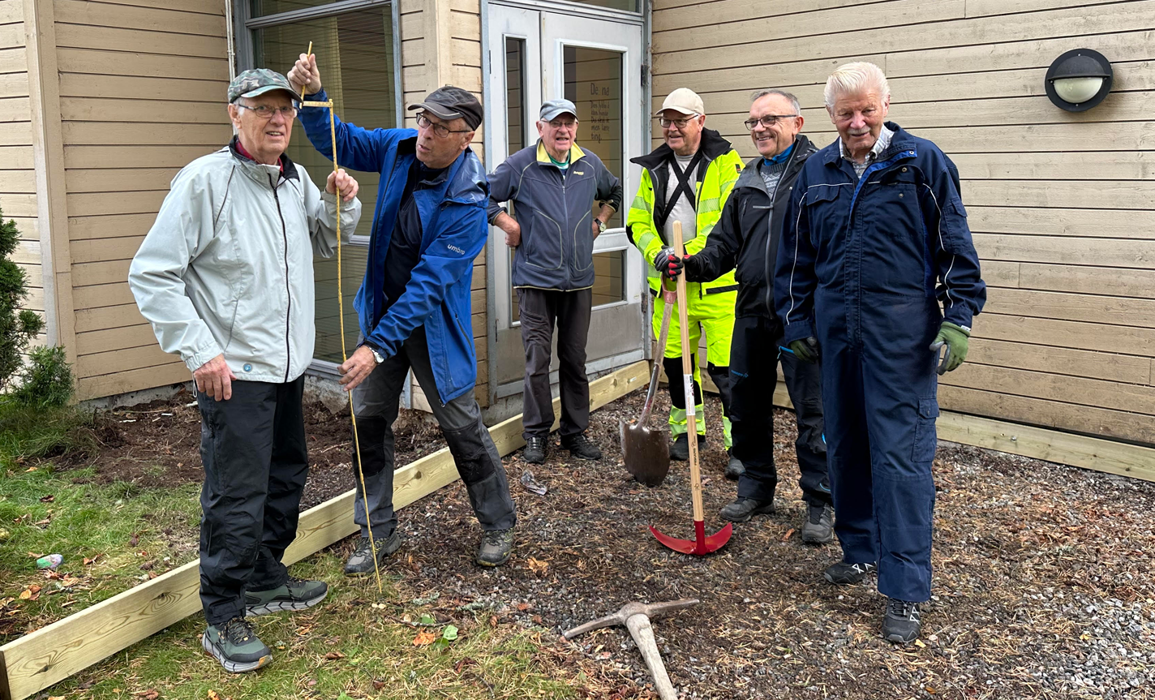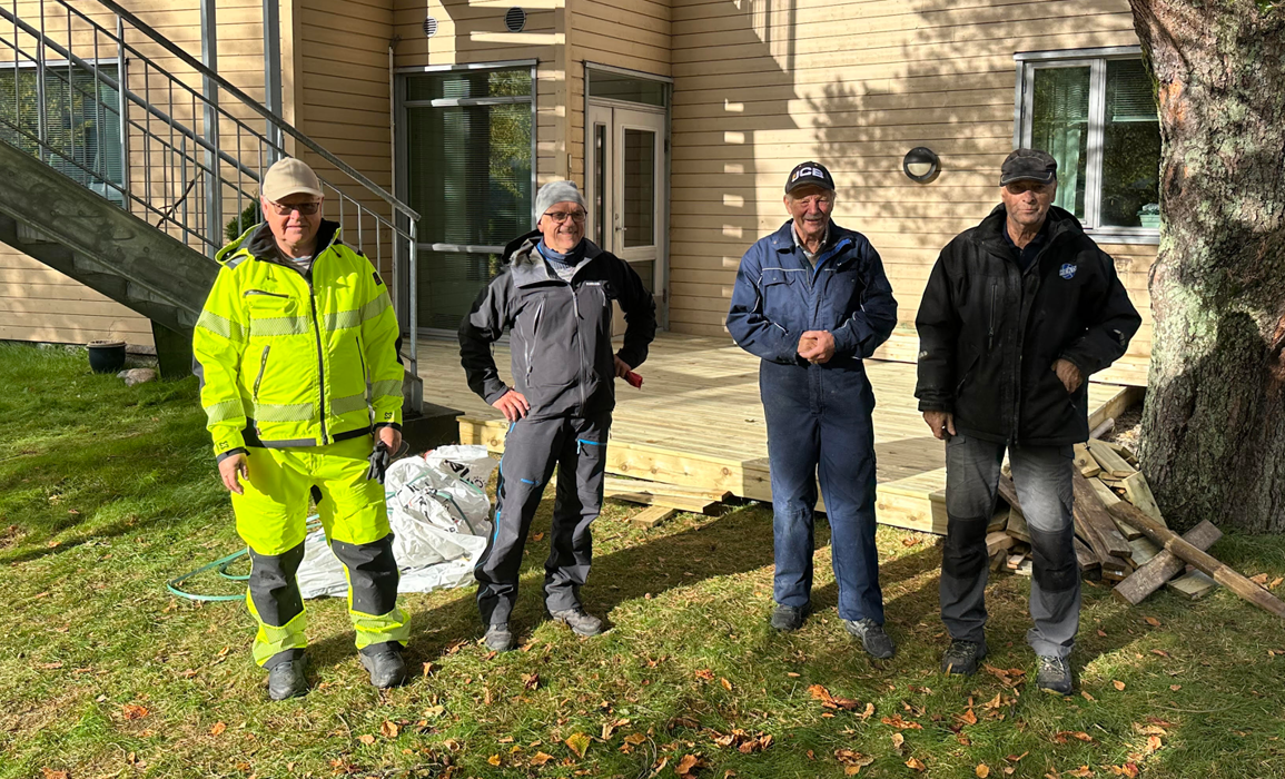 var en del av klubbmedlemmene i aksjon med å bygge opp en platting ved Spjelkavik Omsorgssenter (den gamle ble fjernet i slutten av september). God innsats ga et fint resultat som beboere ved senteret nmå kan gjøre bruk av.