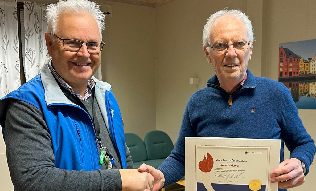 kunne klubben endelig overrekke Per-Stein Bjørkedal en fortjent Lions-Fakkel for hans mangeårige innsats i klubben på en rekke områder. (Se artikkelbildet).